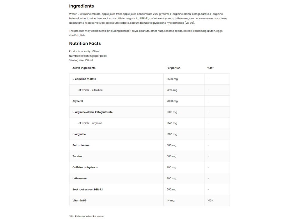 - SPRÁVNĚ SLOŽENÉ OBSAHY AKTIVNÍCH SLOŽEK - Jedna dávka našeho předtréninkového přípravku je kombinací 3500 mg L-citrulin malátu, 1600 mg AAKG, 800 mg beta-alaninu, 500 mg taurinu, 200 mg bezvodého kofeinu a 200 mg L-theaninu, navíc obohacená o glycerol, extrakt z červené řepy a vitamin B6