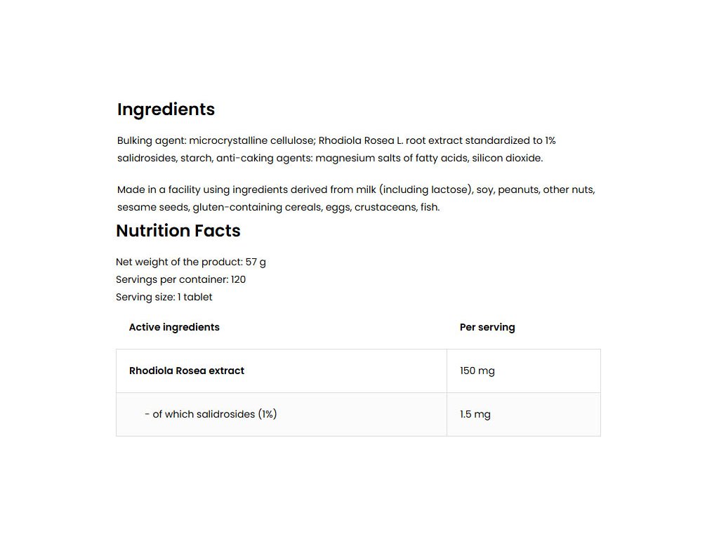 - Zdroj extraktu rhodiola rosea - jedna porce doplňku stravy dodává tělu 150 mg extraktu rhodiola rosea standardizovaného na 1 % salidrosidů