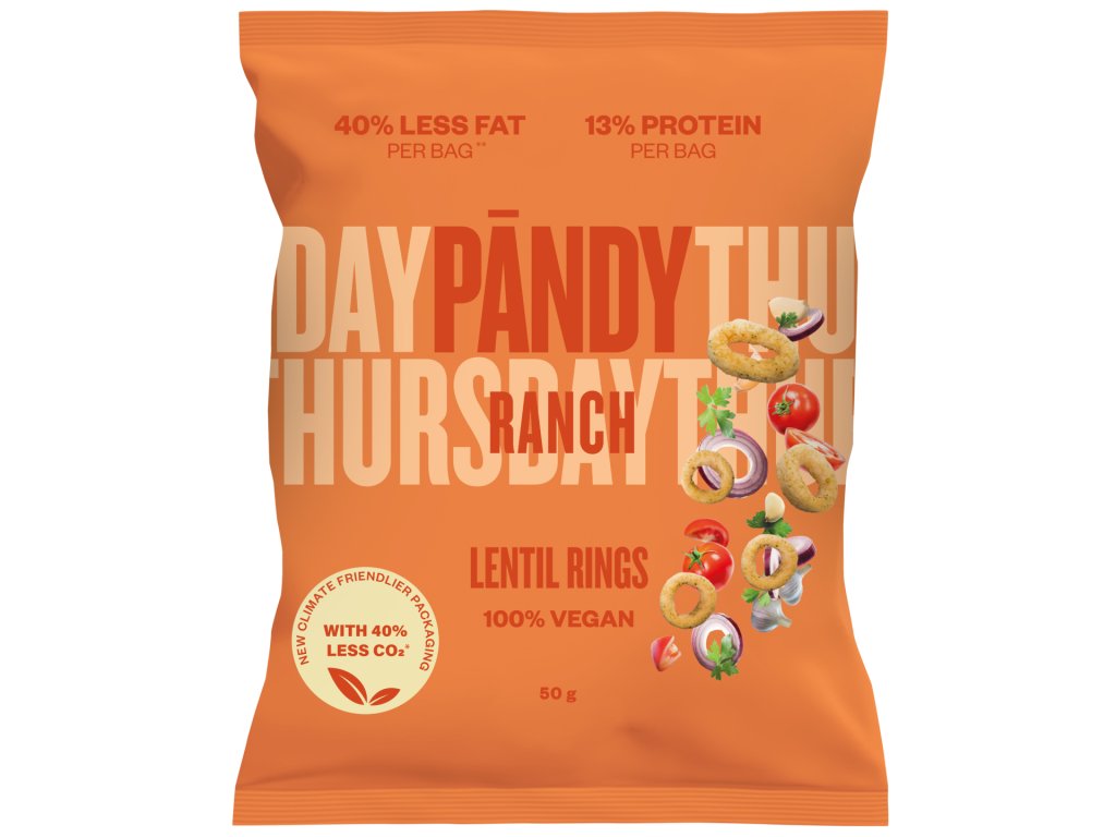Ranch: mouka z červené čočky (42 %), kukuřičná mouka, řepkový olej, rýžová mouka, směs koření (rýžová mouka, sůl, česnek, cukr, chilli, cibule, přírodní aromata, kvasnicový extrakt, dextróza, citronová šťáva v prášku, extrakt z koření), sůl. Upozornění: Může obsahovat lepek a mléko.