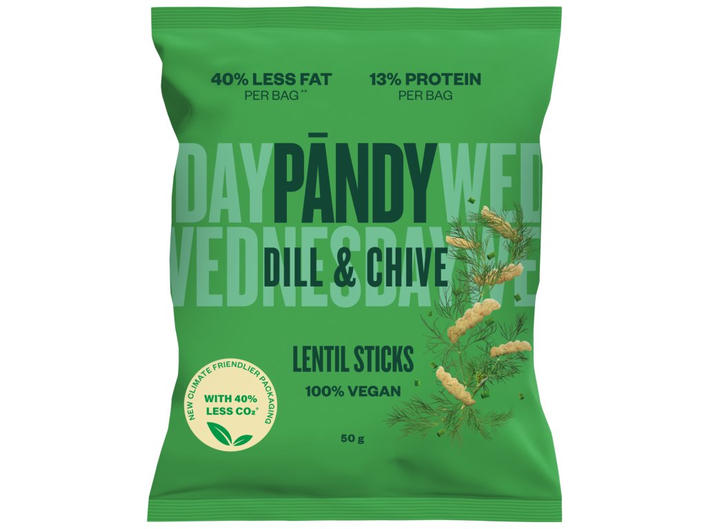 Kopr-pažitka: mouka z červené čočky (42 %), kukuřičná mouka, řepkový olej, rýžová mouka, směs koření (rýžová mouka, dextróza, sůl, cukr, cibule, přírodní aroma, bylinky (kopr, pažitka) 0,3 %, citronová šťáva, bylinkový extrakt), sůl.
