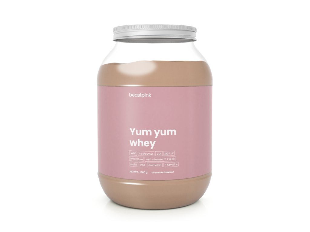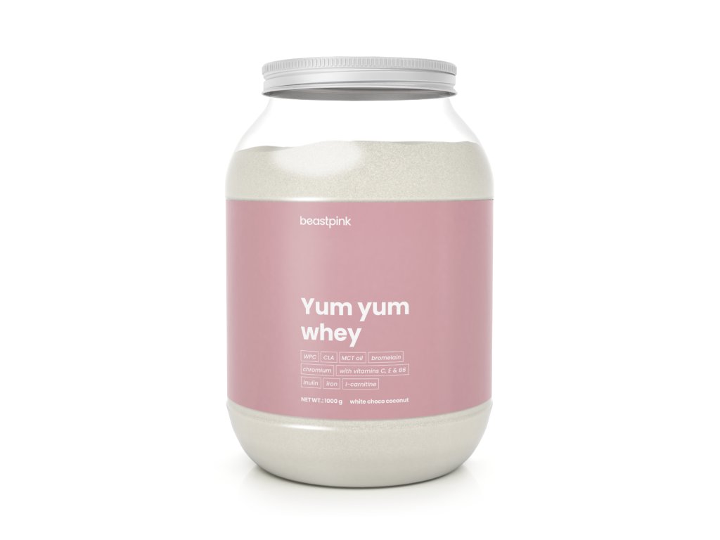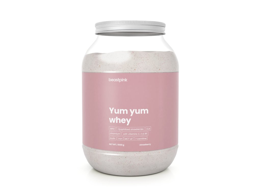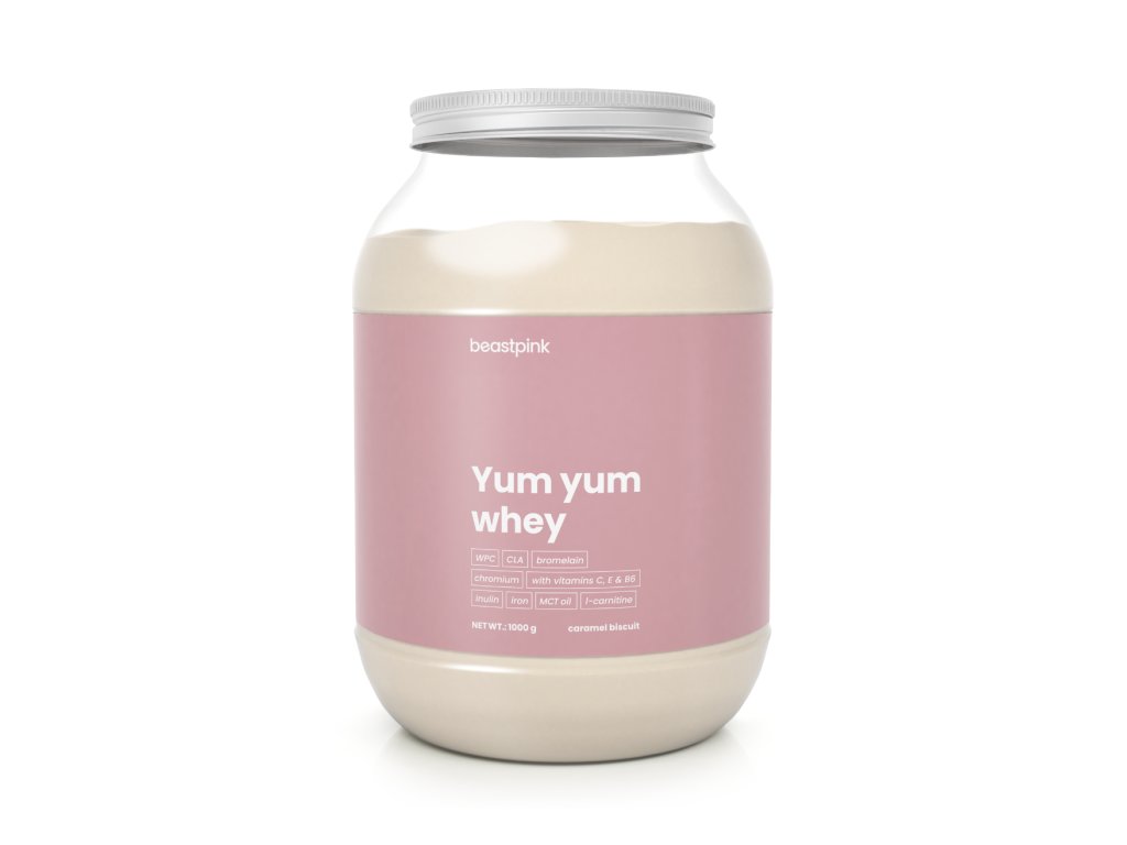 Yum Yum Whey je syrovátkový protein navržený speciálně pro potřeby aktivních žen. V každé dávce přijmete minimálně 20 g bílkovin a pouhých 1,4 g cukru. Nechybí ani funkční látky v podobě l-karnitinu, CLA, MCT oleje, bromelainu nebo inulinu. Stejně tak v něm najdete vybrané vitamíny a minerální látky, například vitamín B6, C, hořčík, železo či chrom.