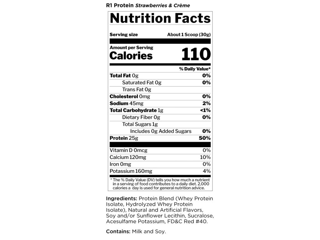 Díky použití superčistého 100% syrovátkového izolátu a rychle působícího syrovátkového hydrolyzátu a úplnému vynechání syrovátkových koncentrátů, smetany, gum a dalších plnidel jsme dosáhli špičkového procentuálního obsahu bílkovin (PPP) až 87 %. Gram za gram má R1 Protein více rychle působících syrovátkových bílkovin na jednotku objemu... tečka.
