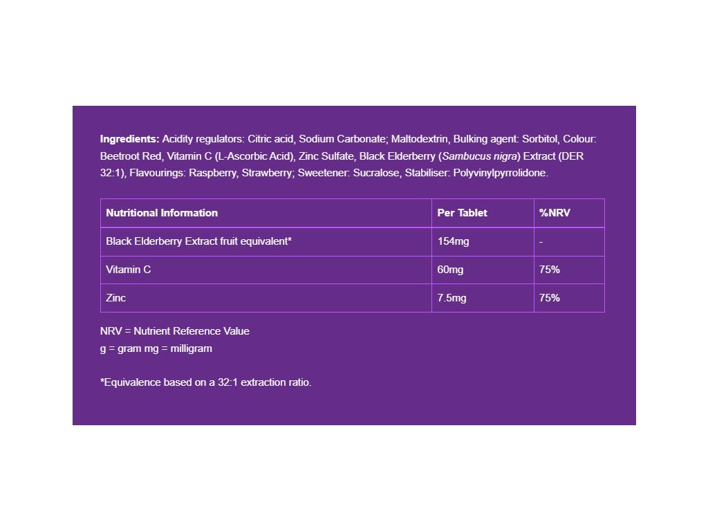 Sambucol Immuno Forte Effervescent obsahuje černý bez s přirozeně se vyskytujícími flavonoidy a vitamin C a zinek, které přispívají k normální funkci imunitního systému a ochraně buněk před oxidativním stresem.