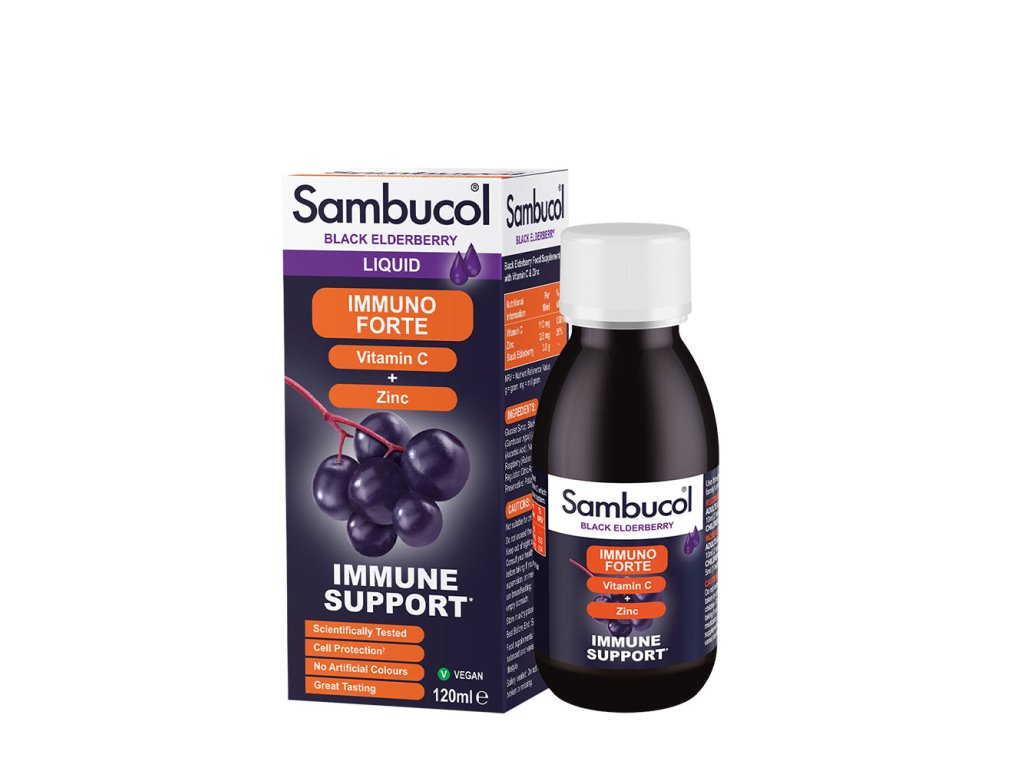 Podpořte svůj imunitní systém s Sambucol Immuno Forte Liquid – lahodným sirupem z černého bezu s přirozeně se vyskytujícími flavonoidy, doplněným o vitamín C a zinek. Vitamín C a zinek přispívají k normální funkci imunitního systému a zároveň přispívají k ochraně buněk před oxidativním stresem 🛡️✨.