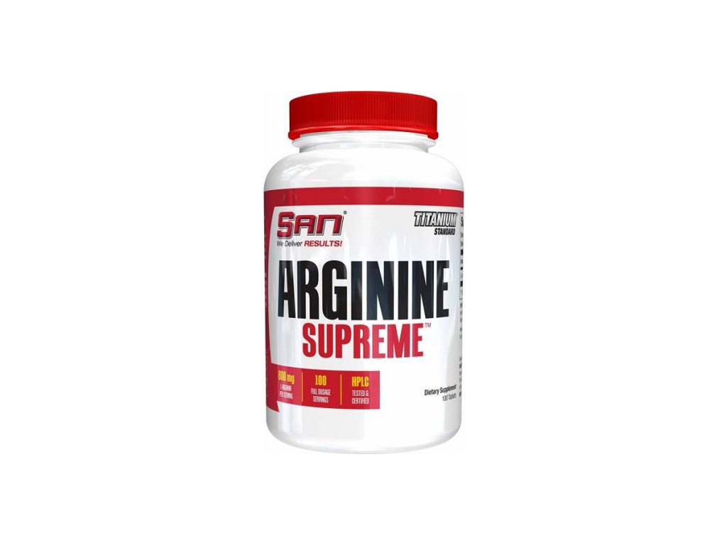 SAN Arginine Supreme™ je doplněk stravy s obsahem L-argininu, který patří mezi aminokyseliny často používané ve sportovní výživě. Každá tableta obsahuje 800 mg čistého L-argininu.