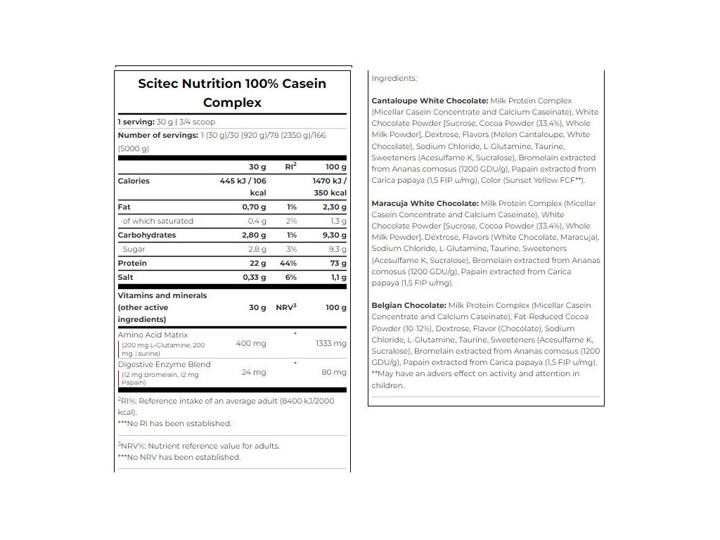 100% Casein Complex je proteinová formule obsahující micelární kaseinový koncentrát i kaseinát vápenatý. Hlavní rozdíly mezi jednotlivými formami kaseinu spočívají v jejich struktuře, chemických vlastnostech a rychlosti využití