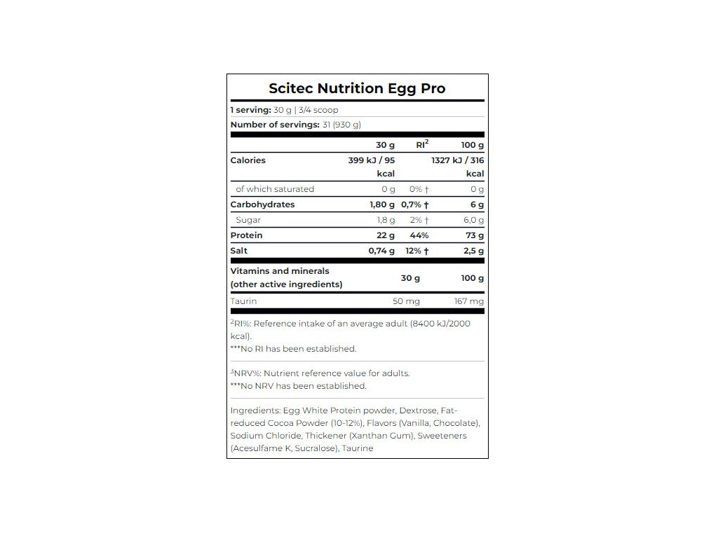 Vysoce kvalitní bílkovina, která má optimální složení nepostradatelných aminokyselin pro lidské potřeby a vysokou stravitelnost. Většinu bílkovin živočišného původu, včetně vaječných bílkovin, lze považovat za vysoce kvalitní bílkoviny. Protein z vaječného bílku je jedním z prvních populárních a kompletních proteinových doplňků, které kulturisté s úspěchem používají. V mnoha vědeckých pracích se používá jako základní standard, se kterým se porovnávají všechny ostatní bílkoviny. Velkou výhodou EGG PRO je, že se nejedná o mléčnou bílkovinu a mohou ho konzumovat například i uživatelé s intolerancí laktózy!