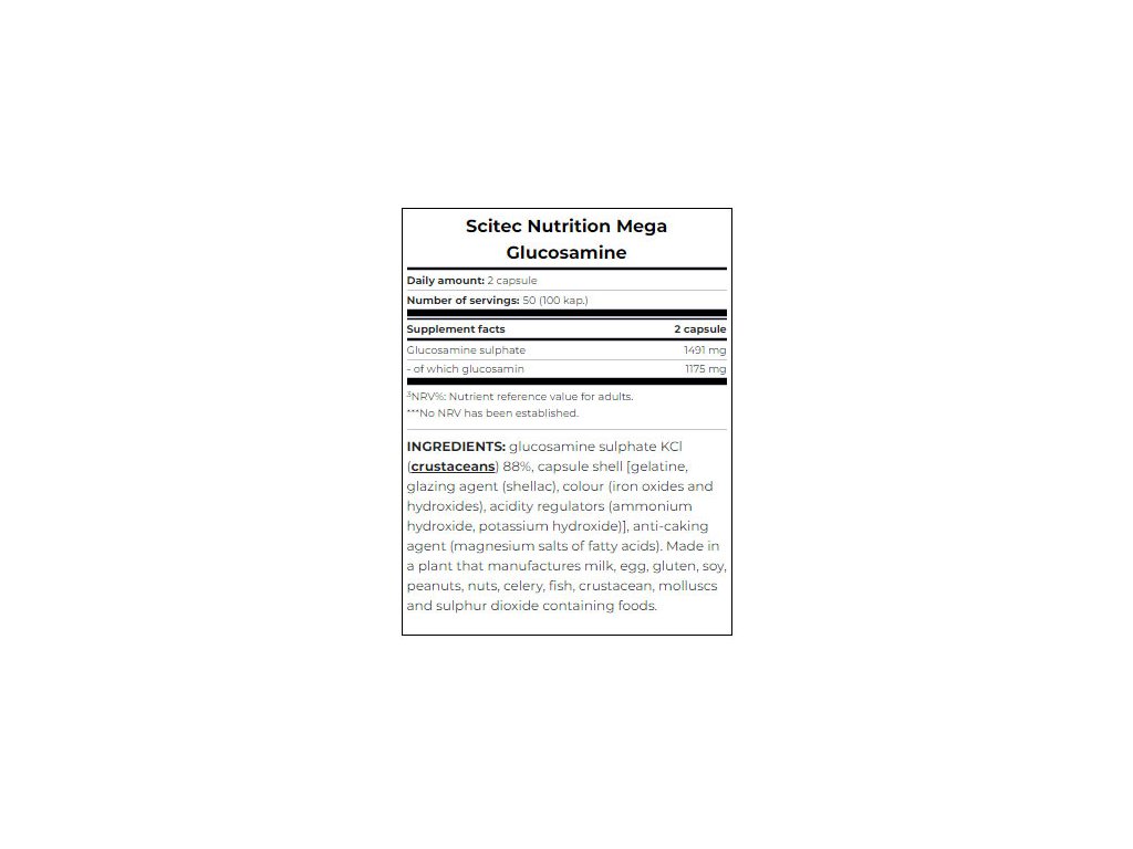 MEGA GLUCOSAMINE poskytuje dostatečnou dávku, 1175 mg glukosamin sulfátu-2KCl v jedné kapsli. Glykosaminoglykany jsou hlavními polymery základní látky pojivové tkáně. Glukosamin je strukturní složkou několika glykosaminoglykanů.Upozornění
