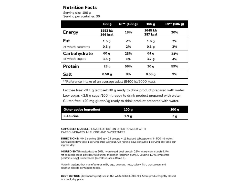 100% Beef Muscle je receptura hovězího proteinu s nízkým obsahem cukru, bez laktózy, lepku a tuku, doplněná sacharidy a esenciální aminokyselinou s rozvětveným řetězcem L-leucinem. Denní dávka výrobku obsahuje 30 g hydrolyzované hovězí bílkoviny, 2 g L-leucinu a 64 g sacharidů, především ve formě maltodextrinu a škrobu. Obsah bílkovin v přípravku může podpořit vaše objemové cíle tím, že přispívá k růstu a udržení svalové hmoty, a sacharidy se podílejí na obnově normální funkce svalů (kontrakce) po vysoce intenzivním a/nebo dlouhodobém cvičení vedoucím ke svalové únavě a vyčerpání zásob kosterního svalového glykogenu. Tohoto příznivého účinku lze dosáhnout příjmem sacharidů z jakéhokoli zdroje až do celkové dávky 4 g/kg tělesné hmotnosti, které se konzumují v několika dávkách během prvních čtyř hodin, nejdéle však do šesti hodin po vysoce intenzivním a/nebo dlouhodobém cvičení vedoucím ke svalové únavě a vyčerpání glykogenu kosterního svalstva. Díky bohaté čokoládové chuti vám zpříjemní odpočinek po tréninku a dodá vám bílkoviny a sacharidy