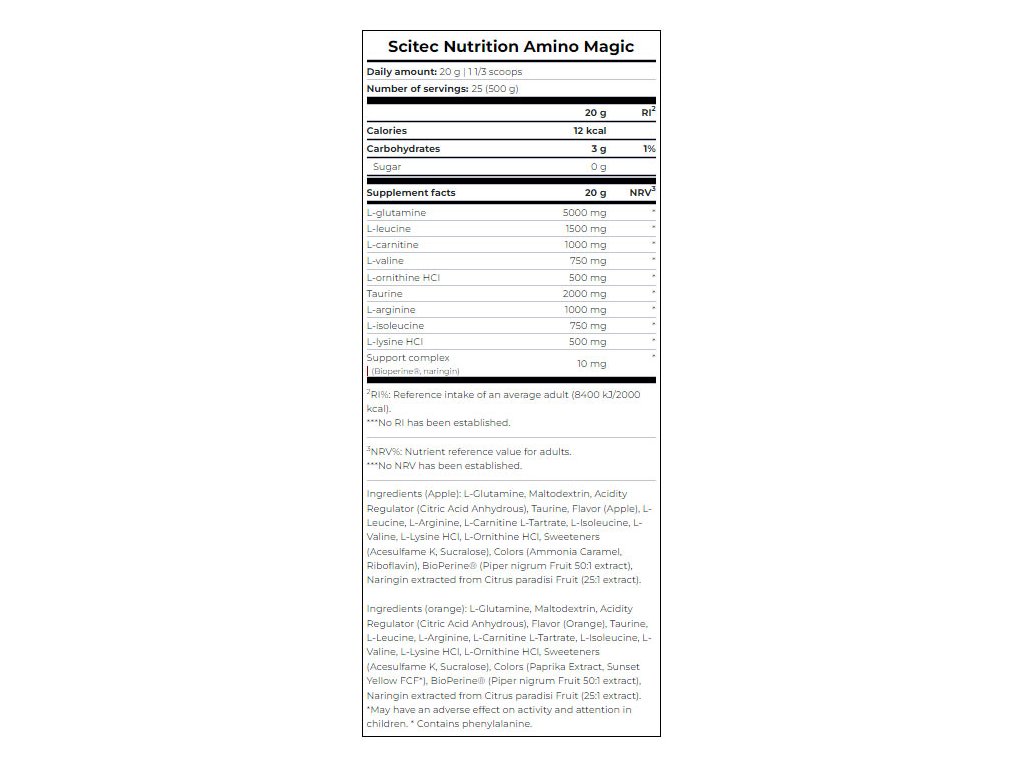 AMINO MAGIC obsahuje esenciální větvené aminokyseliny (BCAA), glutamin, prekurzor oxidu dusnatého (NO) arginin, lysin, ornitin, taurin s derivátem aminokyseliny L-karnitin. Aminokyseliny s rozvětveným řetězcem (BCAA) jsou důležitou skupinou proteinogenních aminokyselin, které tvoří přibližně 35 % esenciálních aminokyselin ve svalových bílkovinách. Přibližně 60 % volných aminokyselin v těle tvoří glutamin, který se při intenzivním sportovním tréninku může stát podmíněně nezbytným. Arginin je bezprostředním prekurzorem oxidu dusnatého (NO) a je nezbytný pro syntézu kreatinu. Naše receptura je navržena tak, aby přispívala k metabolickým požadavkům intenzivně trénované svalové tkáně