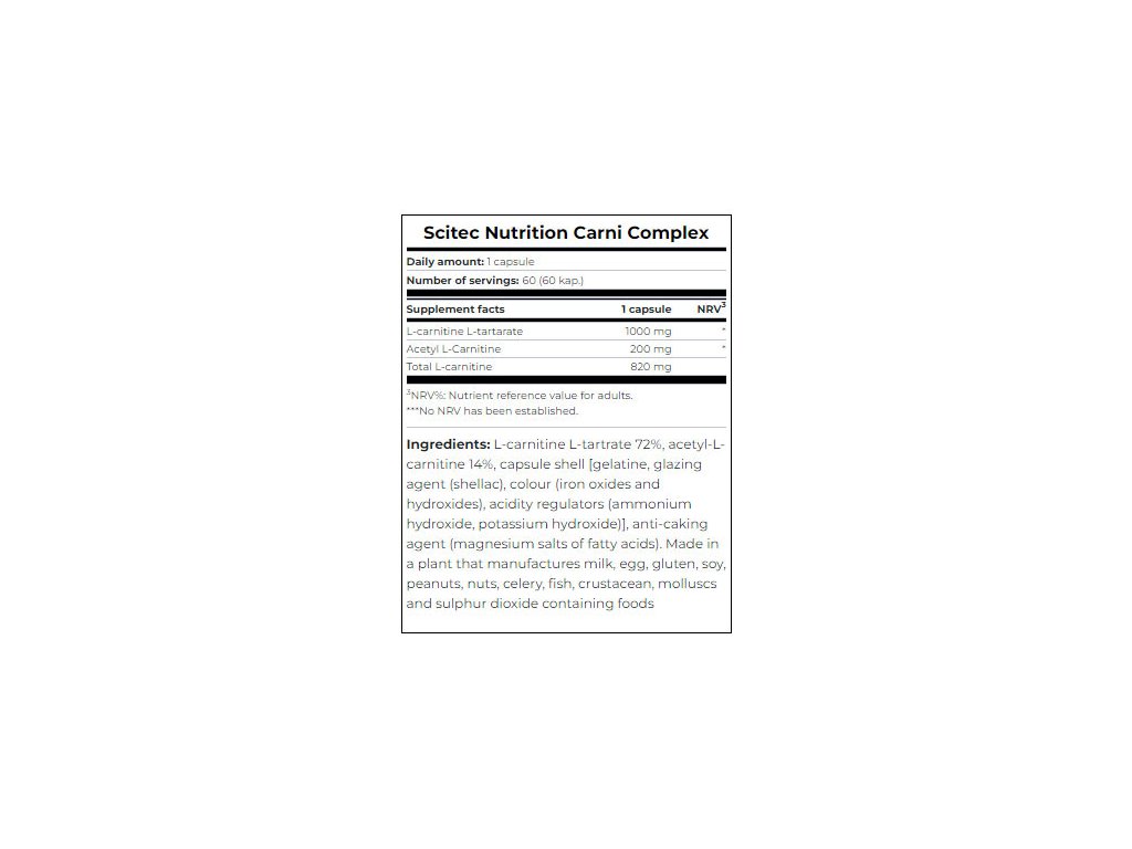 Carni Complex obsahuje L-karnitin ve dvou formách: L-karnitin L-tartrát a acetyl-L-karnitin, což poskytuje celkem 820 mg L-karnitinu v doporučené denní dávce.