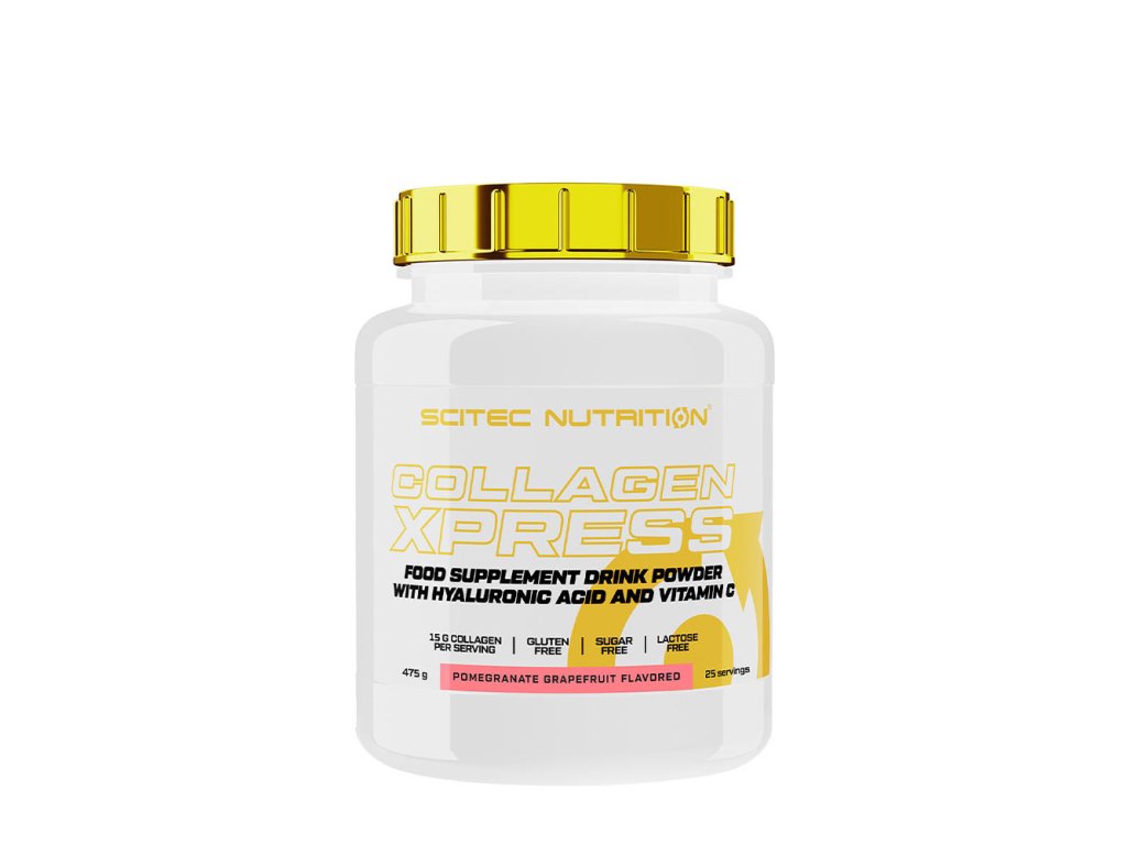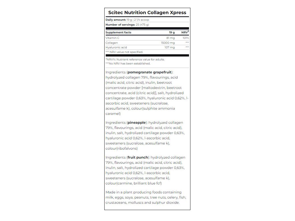 Collagen Xpress obsahuje 15 g kolagenu a vitamin C, který přispívá ke zdravému fungování kůže, žil, kostí a chrupavek tím, že usnadňuje normální syntézu kolagenu. Je důležitou složkou všech produktů, které mají za cíl podpořit tvorbu kolagenu v těle. Tento produkt je také obohacen o kyselinu hyaluronovou!