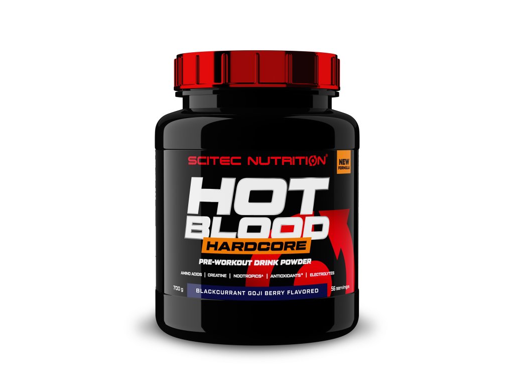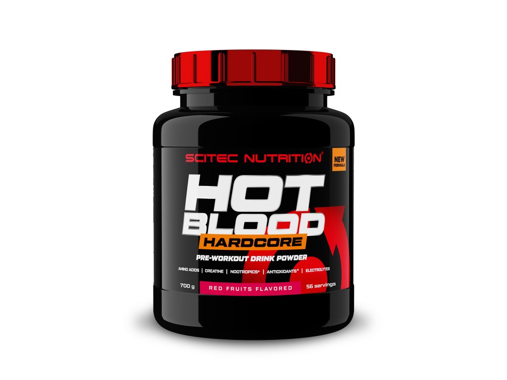 ! Obsahuje kofein, není vhodné pro děti a těhotné ženy. Denní dávka (25 g) obsahuje 300 mg kofeinu. Produkt není vhodný pro osoby trpící přecitlivělostí na kofein.Nová generace oblíbeného předtréninkového suplementu s vylepšeným složením! Scitec Hot Blood Hardcore je komplexní předtréninkový suplement, který se vyznačuje vysokým obsahem kofeinu, kreatinu, aminokyselin, nootropik, antioxidantů a elektrolytů.