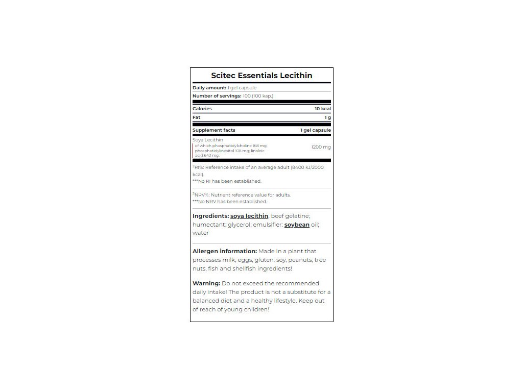 Lecitin je látka podobná tuku, která se nazývá fosfolipid. Skládá se především z vitaminů skupiny B, kyseliny fosforečné, cholinu, kyseliny linolové a inositolu. Lecitin obsahuje všechny fosfatidy, které se přirozeně vyskytují v buněčných membránách. Lecitin působí tak, že udržuje strukturu buněčné membrány a zvyšuje její tekutost. Každá měkká gelová kapsle lecitinu obsahuje 1200 mg přírodního lecitinu získaného ze sójových bobů.Upozornění