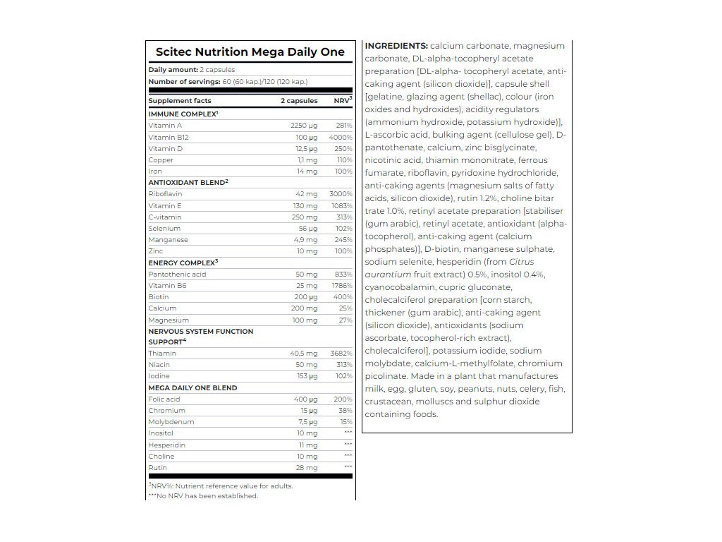 Mega Daily One Blend obsahuje kyselinu listovou, chrom a molybden, dále inositol, cholin a rostlinné polyfenolické sloučeniny hesperidin a rutin. Foláty (vitamin B9) patří mezi vitaminy skupiny B a přispívají mimo jiné ke snížení míry únavy a vyčerpání, ke správné funkci imunitního systému a k normální tvorbě krve. Chrom je nezbytný stopový prvek, který se podílí na normálním metabolismu makroživin a udržování normální hladiny glukózy v krvi, a molybden přispívá k normálnímu metabolismu aminokyselin obsahujících síru