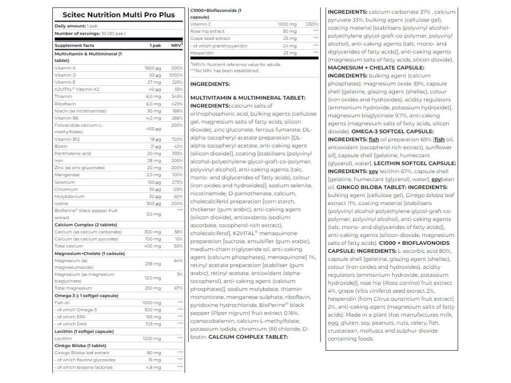 Jeden sáček Multi Pro Plus obsahuje celkem 29 účinných látek na den, včetně 13 vitaminů, 9 minerálů a 4 rostlinných extraktů. Díky praktickému balení v sáčcích nemusíte kupovat každou ingredienci zvlášť - sadu jsme vám již připravili! Toto řešení usnadňuje doplnění denní potřeby vitamínů a minerálůNové složení obsahuje také kyselinu listovou, zinek a některé druhy vápníku a hořčíku z organických zdrojů, jakož i dvě složky chráněné ochrannou známkou, a to K2VITAL® K2 s vitaminem K a extrakt z černého pepře BioPerine®.