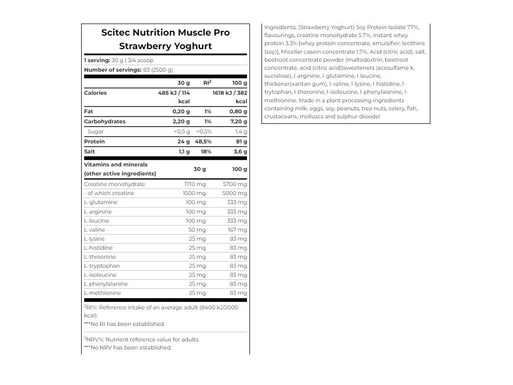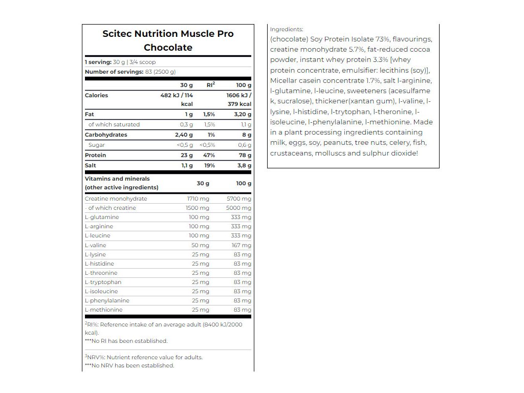 Muscle Pro proto obsahuje sójový protein, syrovátkový proteinový koncentrát a kasein. Kromě dvou doporučených denních dávek získáte také 3 gramy kreatinu. Kreatin v této denní dávce zvyšuje fyzickou výkonnost při krátkých dávkách vysoce intenzivního cvičení. To v kombinaci s výše zmíněným účinkem bílkovin dělá z Muscle Pro vítěznou kombinaci!Upozornění