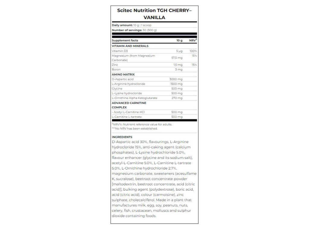 TGH představuje novou generaci optimalizátorů testosteronu. Obsahuje DAA (kyselinu D-asparagovou) v dávce 3 gramy a karnitiny ve formě L-karnitin L-tartrátu a acetyl L-karnitinu. Amino matrix obsahuje kyselinu D-asparagovou, L-arginin hydrochlorid, L-ornitin hydrochlorid a L-ornitin hydrochlorid a glycin