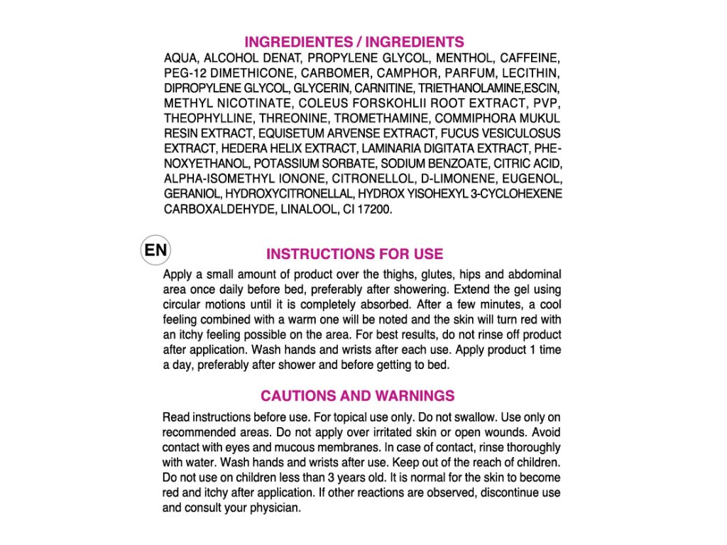 Aplikujte malé množství přípravku na stehna, hýždě, boky a oblast břicha jednou denně před spaním, nejlépe po osprchování. Krouživými pohyby roztírejte redukční krém pro ženy, dokud se zcela nevstřebá. Po několika minutách se dostaví chladivý pocit spojený s pocitem tepla a kůže zčervená a může dojít ke svědění v dané oblasti. Pro dosažení nejlepších výsledků přípravek po aplikaci neoplachujte. Po každém použití si umyjte ruce a zápěstí. Přípravek aplikujte jednou denně, nejlépe po sprchování a před spaním.Skladování