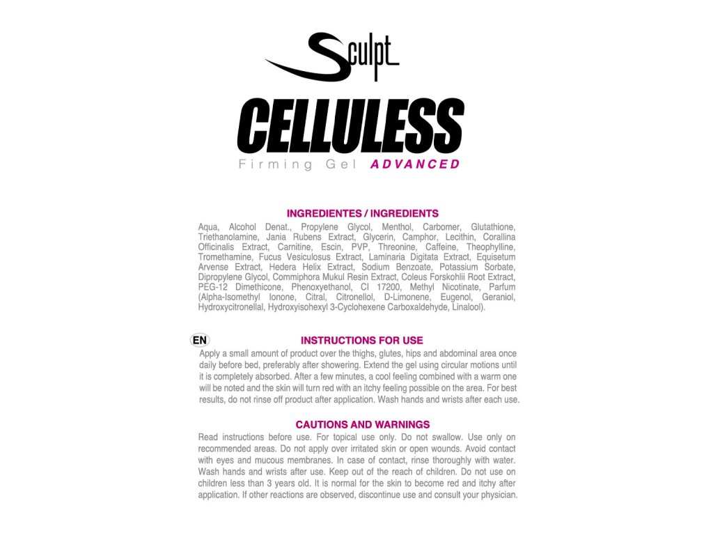Pokročilá formule oblíbeného a účinného přípravku proti celulitidě a redukci Celluless®, posílená o nejlepší patenty: Actiporin 8GTM, ActisculptTM a Bio SlimTM, jakož i o nejlepší složky získané z nejnovějších vědeckých výzkumů, jako je korallin a glutathion.