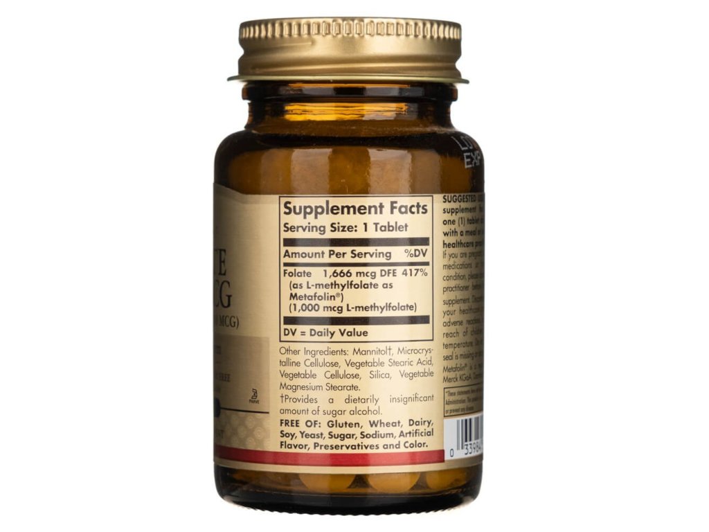 | Foláty (jako L-methylfolát jako Metafolin ®) (1, 000 mcg jako L-methylfolát) | 1666 mcf DFE | 407% |