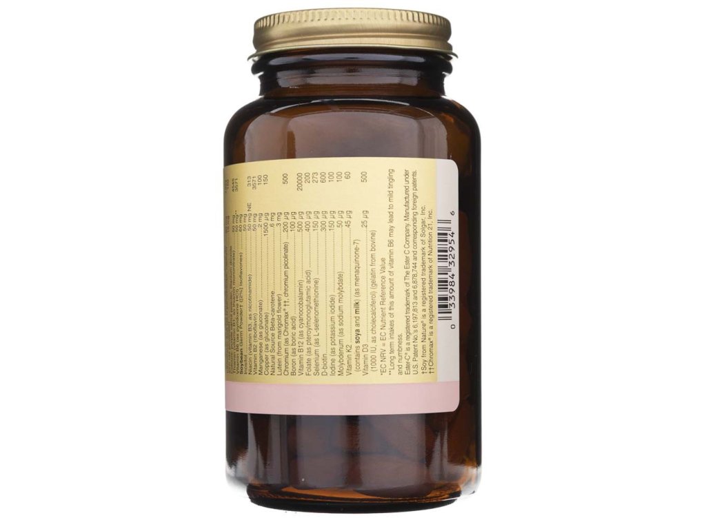 Citrát vápenatý, askorbát vápenatý, mikrokrystalická celulóza, fosforečnan vápenatý, škrob, alginát, dextrin, hořčík (citrát, oxid), ester-C®, komplex citrusových bioflavonoidů, rostlinná kyselina stearová, oxid křemičitý, rostlinný stearan hořečnatý, potah: hydroxypropylmethylcelulóza, rostlinný glycerin, pikolinát zinku, thiamin, pyridoxin, sójové klíčky, lutein, Chromax®, beta-karoten, selenometionin, měď, biotin, jód, molybden, vitamin K2 (obsahuje sóju a mléko), vitamin D3 (hovězí želatina).
