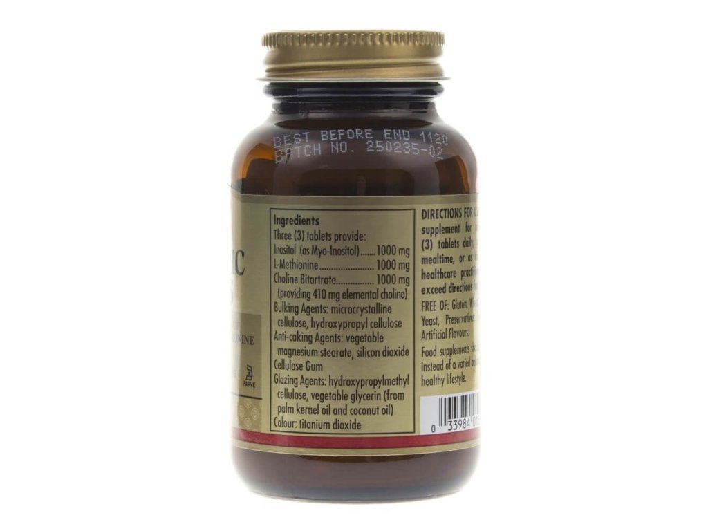 Solgar Lipotropic Factors je doplněk stravy ve formě tablet, který kombinuje tři klíčové látky: cholin, inositol a L-methionin. Tyto složky společně podporují metabolismus tuků, detoxikaci organismu a správnou činnost jater. 🌿