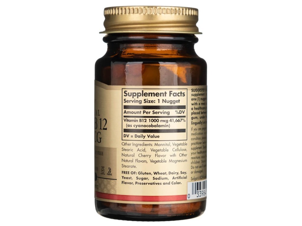 Solgar® Vitamin B12 1000 µg je vysoce kvalitní doplněk stravy ve formě chutných nugetek s přírodní třešňovou příchutí 🍒. Vitamin B12 (kyanokobalamin) patří do skupiny vitaminů B-komplexu a je klíčový pro tvorbu energie, nervový systém a zdraví srdce.