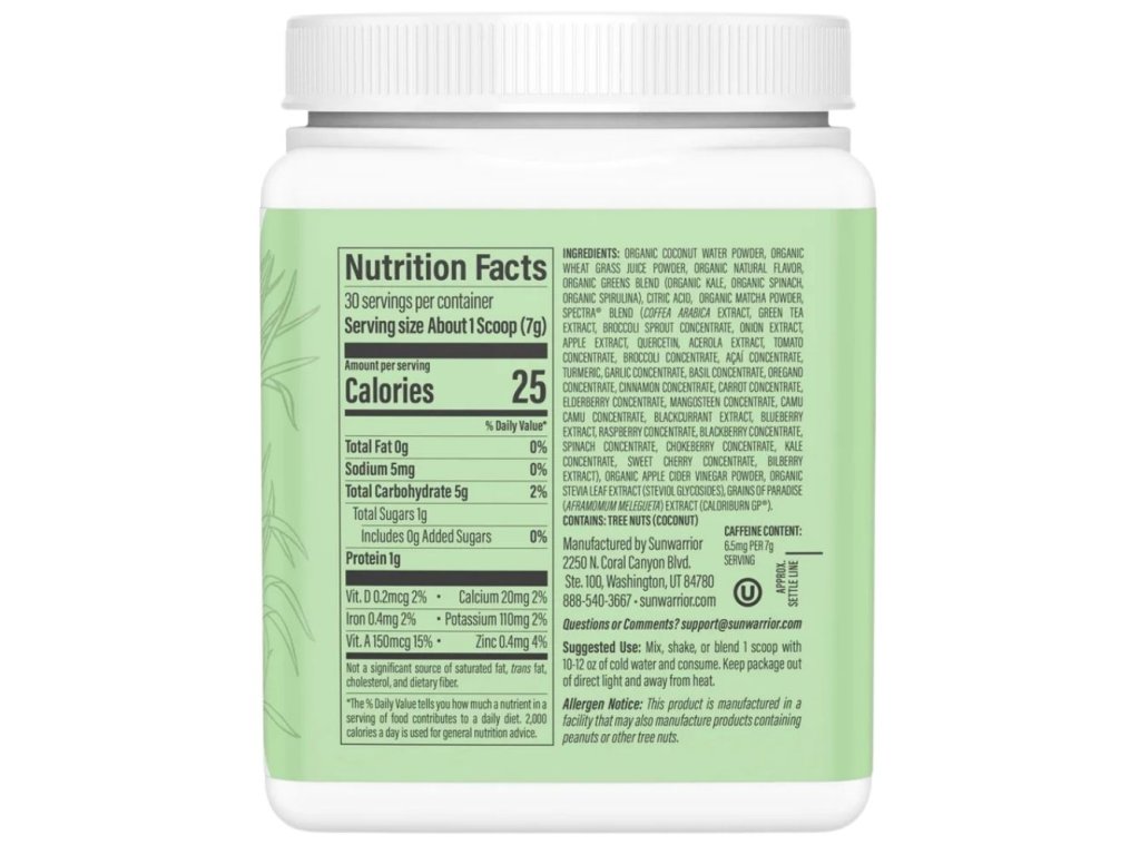 Organické složky: kokosová voda v prášku, šťáva z pšeničné trávy, kapusta, špenát, spirulina, matcha