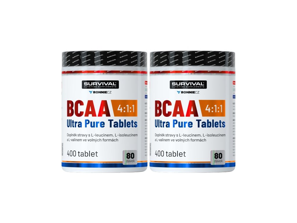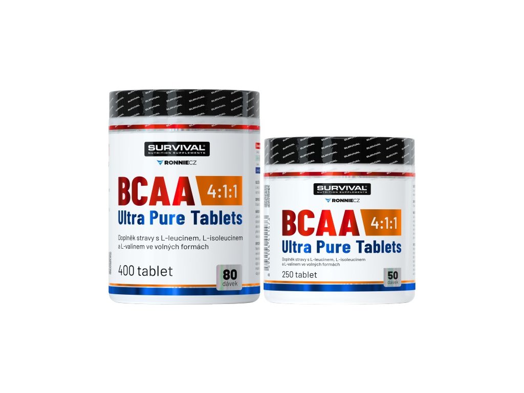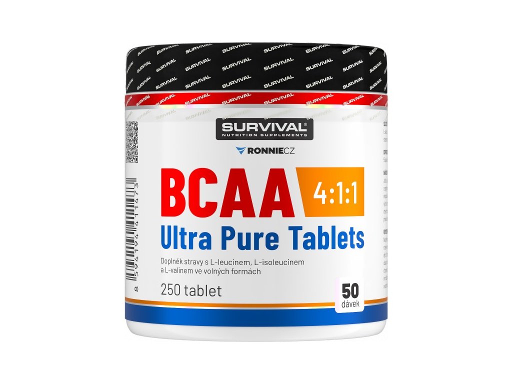 Nové a lepší BCAA 4:1:1 Ultra Pure Tablets značky Survival jsou silné aminokyselinové tablety vyrobené moderní technologií, která umožňuje použití naprostého minima pojivových látek, a to jak co do jejich počtu, tak do jejich procentuálního zastoupení. Získáváte tak produkt, který dodá Vašemu tělu velmi snadno a rychle využitelné volné aminokyseliny a zároveň ho nezatíží žádnými zbytečnými balastními pojivy.