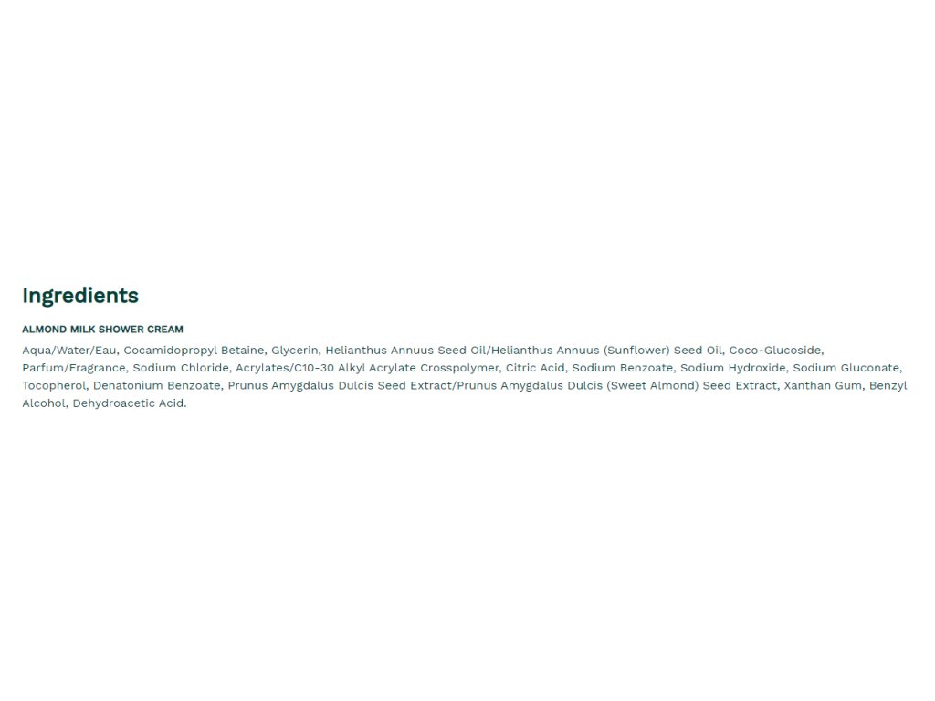 Náš sprchový krém, který je nyní certifikován Vegan Society a je vyroben z 93 % ze složek přírodního původu, včetně komunitního fairtradového mandlového mléka ze Španělska, pomáhá zanechat pokožku jemnou, čistou a hydratovanou. Tato vůně voní po sladkých mandlích - přenese vás do prosluněného mandlového háje s tóny santalového dřeva, jasmínu, růže a pižma.