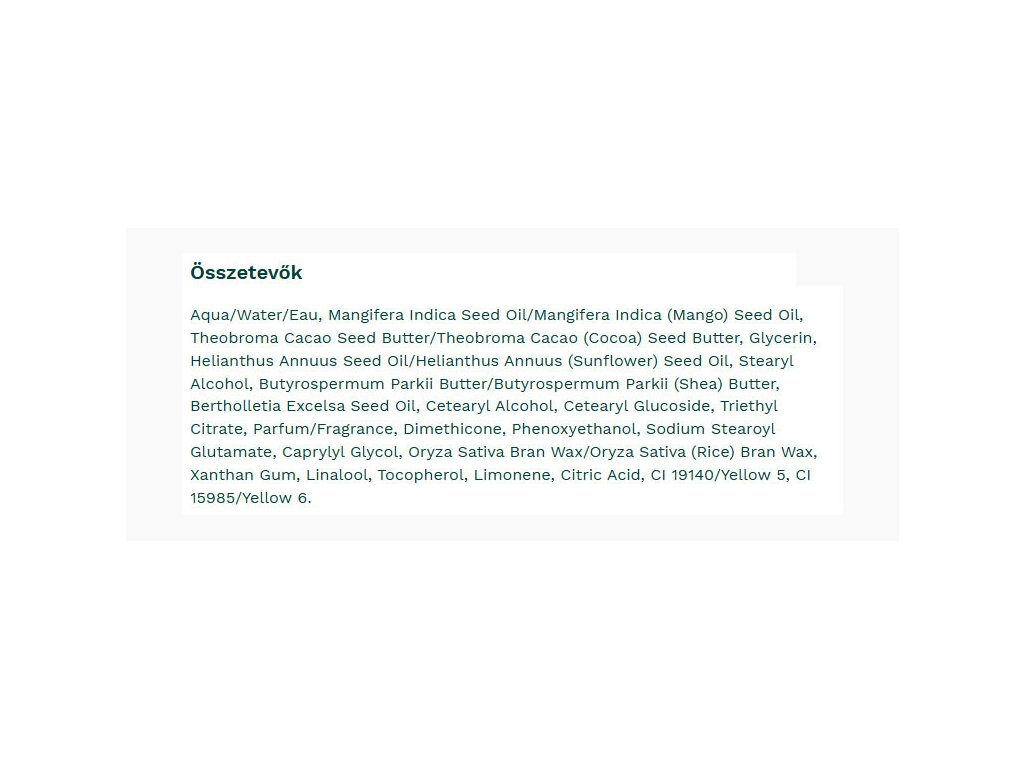 Je obohacen o 96 % přírodních složek, včetně fairtradového oleje ze semen manga z Indie, fairtradového ručně vyráběného bambuckého másla z Ghany a fairtradového oleje z brazilských ořechů z Peru.