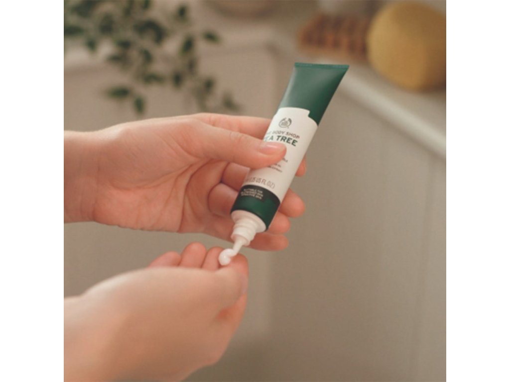 3. Na závěr použijte hydratační přípravek Tea Tree pro čištění pleti. Stačí vytlačit množství o velikosti hrášku a poté jej rozetřít na pleť, přičemž se vyhněte očnímu okolí