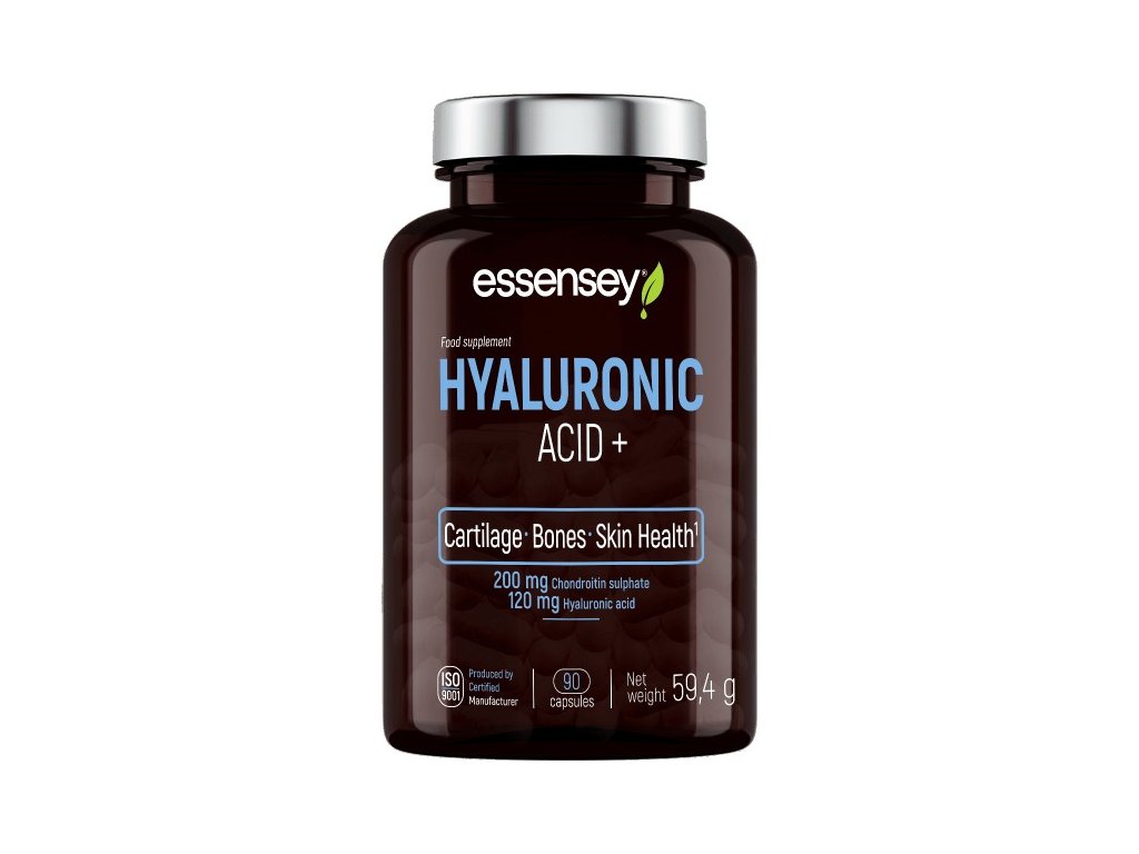 Hyaluronic Acid + značky Essensey (Trec Nutrition) nabízí chondroitin sulfát, kyselinu hyaluronovou, L-prolin a vitamín C, který přispívá k normální tvorbě kolagenu pro normální funkci chrupavek, kostí a kůže.