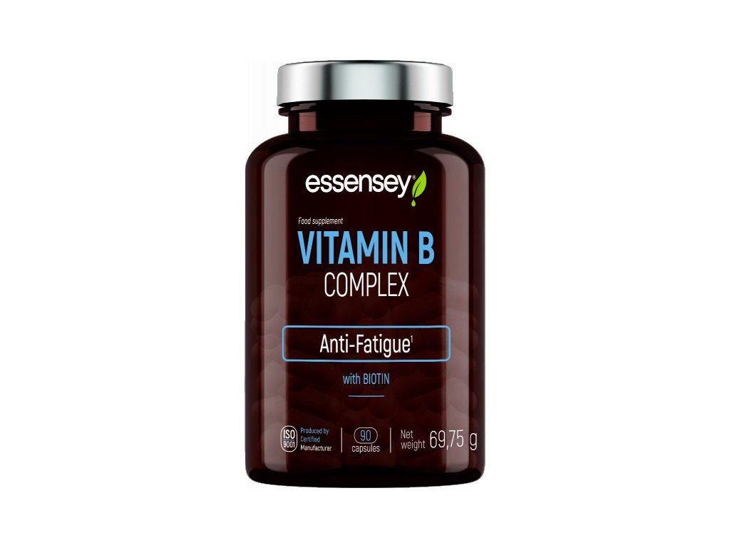 Vitamin B Complex značky Essensey (Trec Nutrition) nabízí komplex vitamínů B s biotinem (B-komplex: B1, B2, B3, B5 - pantothenová kyselina, B6, B8 - inositol, B10 - PABA, cholin, B9 - listová kyselina, B12). Riboflavin, niacin, vitamín B6 a B12 přispívají ke snížení únavy a vyčerpání. Thiamin, riboflavin, B6, B12 a biotin přispívají k normálnímu energetickému metabolismu.
