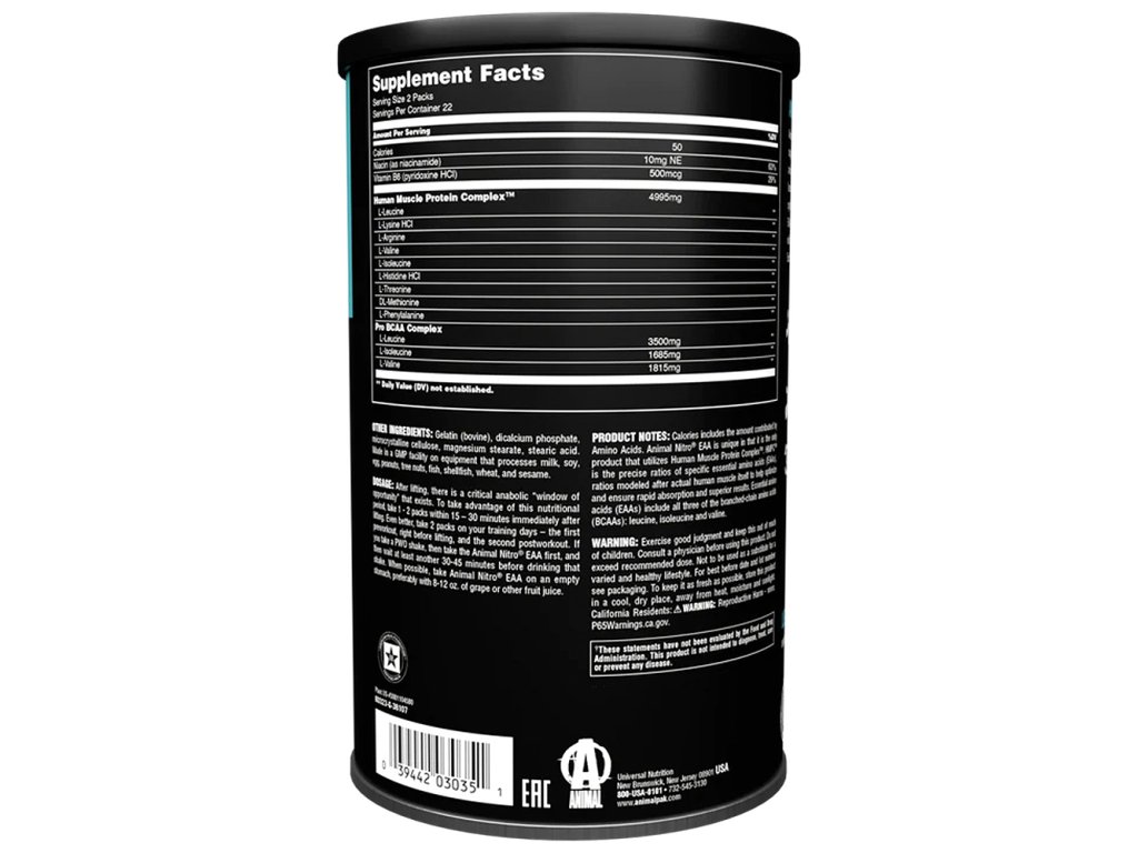 Každé balení Animal Nitro obsahuje odměřenou dávku 6000 mg nespojených aminosacharidů. Po požití rychle vytvoří speciální bolus (ochrannou hmotu), který jim umožní účinně obejít játra. Po průchodu játry se tento bolus dostane do systémového oběhu, kde může uplatnit své silné účinky. V kombinaci se seriózním odporovým tréninkem může Animal Nitro skutečně pomoci vašemu tělu dodat více živin do pracujících svalů, rychleji se zotavit a budovat novou svalovou hmotu tím, že zvyšuje syntézu bílkovin, zlepšuje čistou bilanci svalových bílkovin a zabraňuje odbourávání svalů