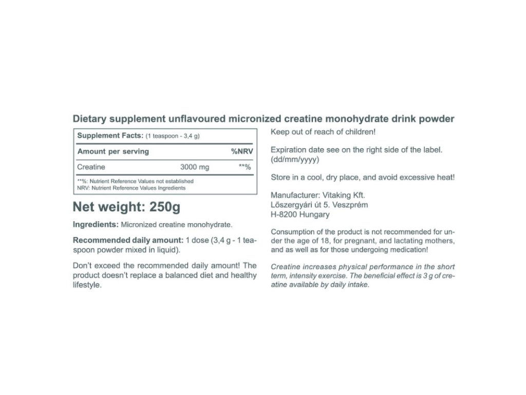 Kreatin je přirozeně se vyskytující aminokyselina, která se přirozeně vytváří v těle, ale v různém množství se nachází v různých druzích masa, jako je sleď, losos, tuňák, vepřové a hovězí maso. V lidském těle je většina uložena v kosterním svalstvu (uvolňuje se z něj při fyzické aktivitě), menší část je uložena v mozku a srdci. Podporuje svaly během intenzivního tréninku. Tento produkt obsahuje 250 g mikronizovaného kreatinu monohydrátu.- Zvyšuje fyzickou výkonnost při krátkém, sekvenčním pohybu vysoké intenzity.