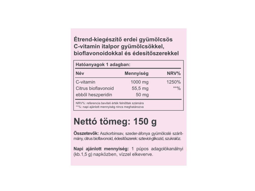 Hledáte něco opravdu speciálního a zdravého? Zkuste to! Je to jeden z našich nejlepších nápojů s vitaminem C, citrusovými bioflavonoidy a příjemnou ostružinovou příchutí. Rozjasněte si den osvěžujícím instantním nápojem s příchutí ostružin, který vám rychle a snadno dodá potřebný vitamín C a zároveň vám dodá nádech luxusu a potěšení z každodenního života díky chuti ostružin. 1 denní dávka obsahuje 1000 mg vitamínu C + 55 mg citrusových bioflavonoidů (včetně 50 mg hesperidinu).
