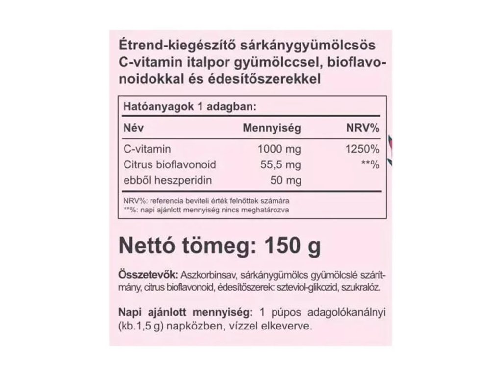 1 denní dávka obsahuje 1000 mg vitaminu C + 55,5 mg citrusových bioflavonoidů (z toho hesperidin 50 mg) Příchutě: extrakt ze šťávy dračího ovoce, steviol-glykosid, sukralóza.