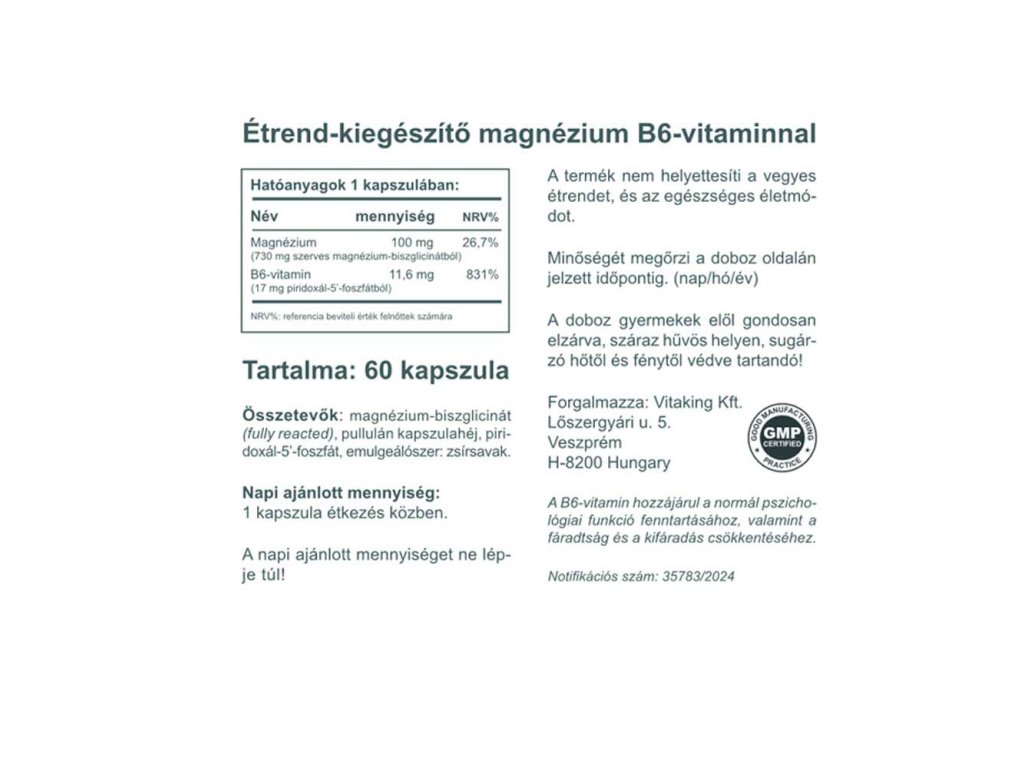 Kapsle Vitaking Organic Bisglycinát hořečnatý + P5P jsou doplňkem stravy obsahujícím bisglycinát hořečnatý (plně zreagovaný) a aktivní formu vitaminu B6, pyridoxal-5′-fosfát (P5P).