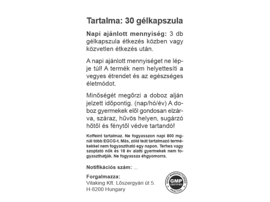 Nepřekračujte doporučené denní množství! Výrobek nenahrazuje vyváženou stravu a zdravý životní styl. Obsahuje kofein. Nekonzumujte více než 800 mg EGCG denně. Neužívejte s jinými produkty ze zeleného čaje ve stejný den. Neměly by ho konzumovat těhotné a kojící ženy ani děti mladší 18 let. Nekonzumujte na lačný žaludek.Dávkování