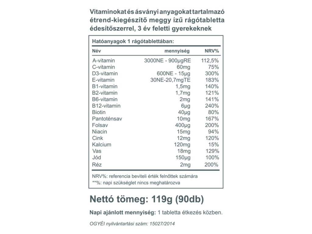 Děti konzumují málo ovoce a zeleniny a mohou mít nedostatek různých vitamínů a minerálů. Pro své zdraví a optimální vývoj však potřebují správné množství všech vitamínů denně. Toto chutné složení multivitaminových žvýkacích tablet je vytvořeno tak, aby vyhovovalo potřebám těch nejmenších.