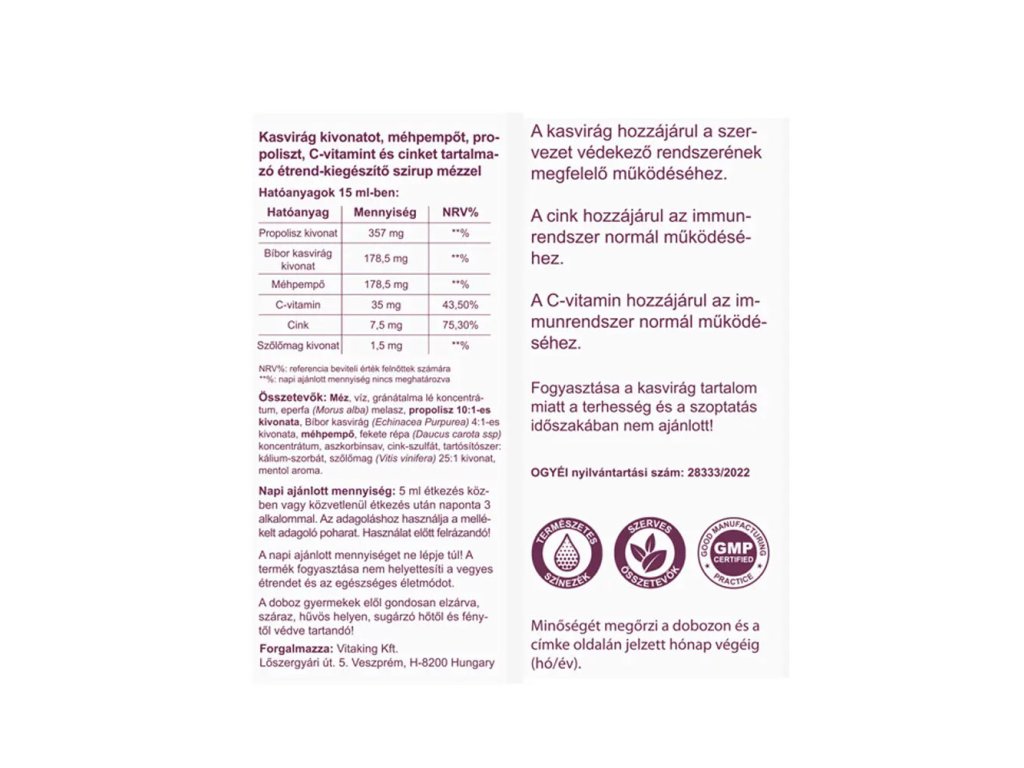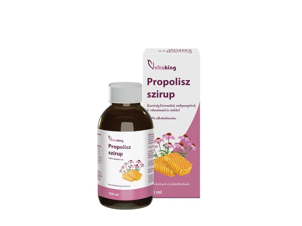 Vitaking Propolisový sirup je tekutý doplněk stravy obsahující extrakt z březového květu, mateří kašičku, propolis, vitamin C a zinek slazený medem. Je 100% bez alkoholu a doporučuje se pro děti i dospělé.