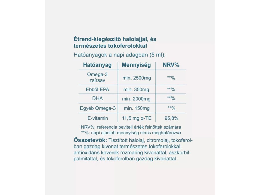 Vitamínový olej Omega-3 ve 150 ml s čištěným rybím olejem, citronovým olejem, vitaminem E a rozmarýnovým extraktem. Kromě jemné citronové chuti výrobku je chuť ryb téměř neznatelná. Díky příjemné vůni ji lze směle podávat i dětem. Obsah účinné látky: min. 350 mg EPA a min. 2000 mg DHA / denní dávka. Mastné kyseliny EPA a DHA obsažené v rybím oleji přispívají ke správné funkci srdce, DHA přispívá k udržení normální funkce mozku a normálního vidění.