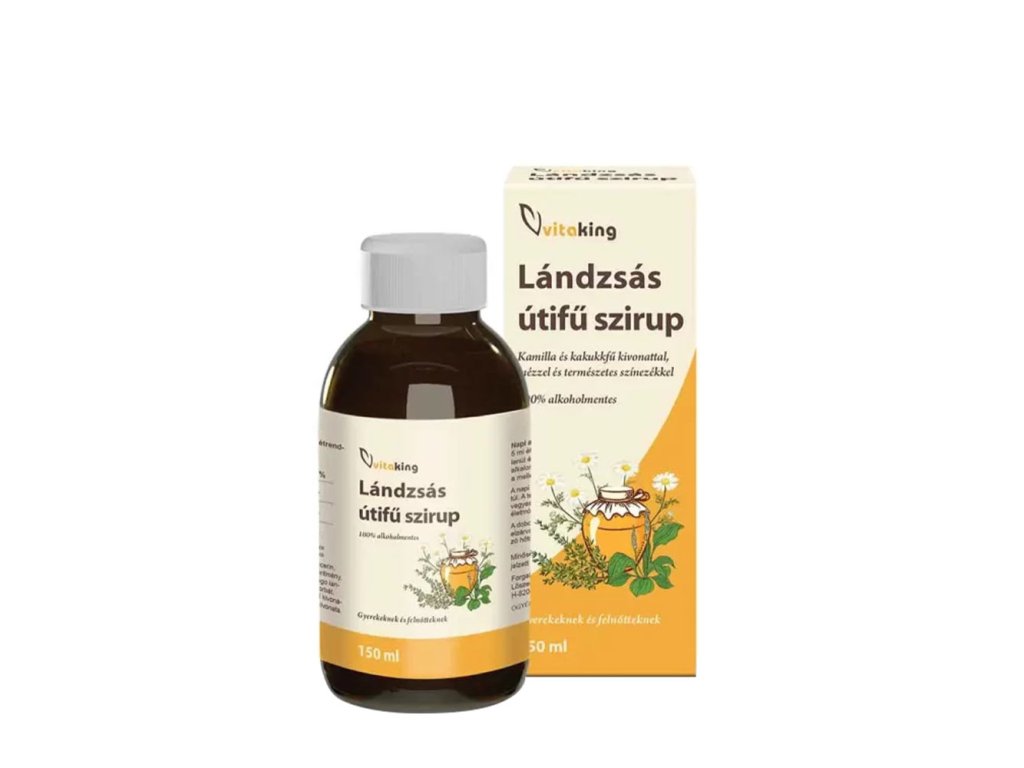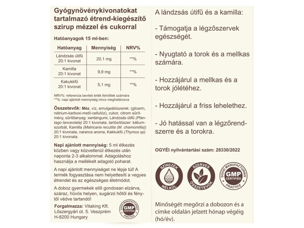 Vitaking Mátový sirup je speciální doplněk stravy obsahující bylinné extrakty na bázi medu. Je 100% bez alkoholu, takže se doporučuje pro děti i dospělé. Denní dávka obsahuje 20,1 mg extraktu z ploštičníku (20:1), 9,9 mg extraktu z heřmánku (20:1) a 5,1 mg extraktu z tymiánu (20:1).- Ploštičník a heřmánek