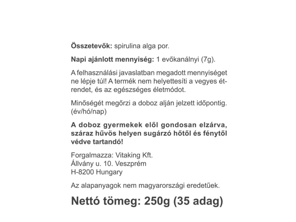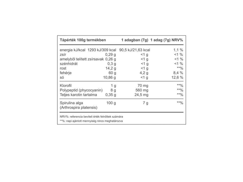 Výzkum prokázal, že 1 g spiruliny je nutričně ekvivalentní 1 kg zeleniny. V poslední době jsou všechny potraviny se spirulinou mezinárodně úspěšné.Upozornění