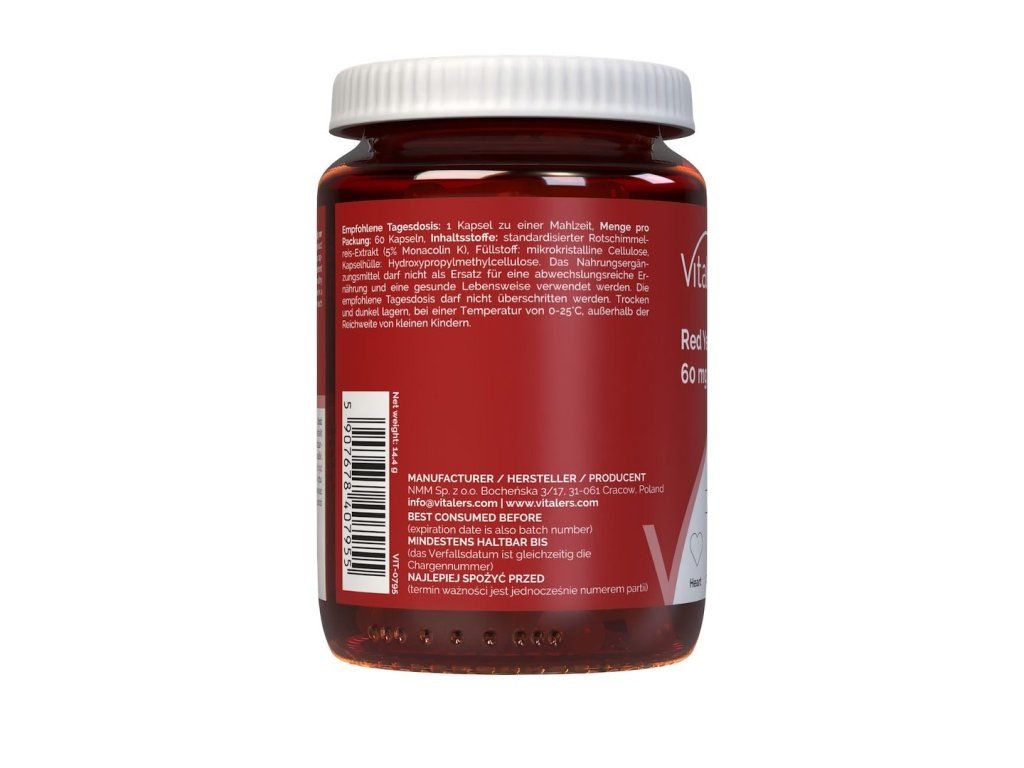 Vitaler's Red Yeast Rice je vysoce kvalitní doplněk stravy ve formě veganských kapslí. Obsahuje fermentovanou červenou rýži získanou pomocí kvasinek Monascus Purpureus, které přirozeně produkují monakolin K – bioaktivní látku podporující udržení normální hladiny cholesterolu v krvi.