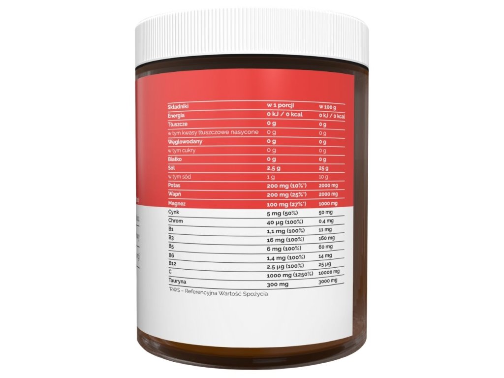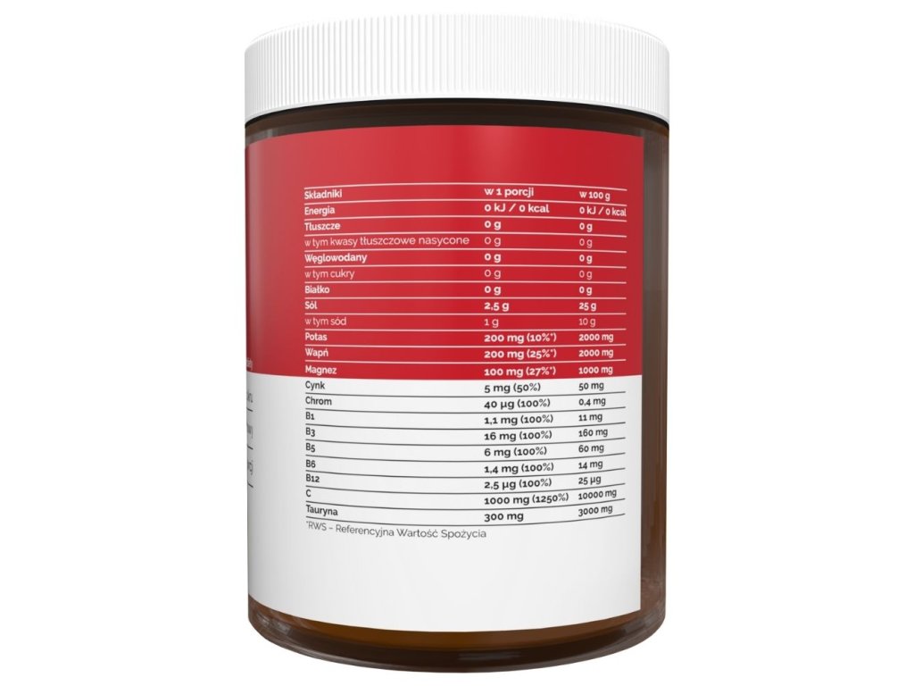 Chlorid sodný, erytritol, kyselina L-askorbová, citrát vápenatý, citrát hořečnatý, citrát draselný, kyselina citronová, taurin, přírodní aroma, barviva (extrakt z černé mrkve, kurkumin), steviol-glykosidy, pikolinát zinku, fumarát železa, niacinamid, pantotenát vápenatý, pyridoxin HCL, thiamin HCL, L-selenometionin, pikolinát chromu, methylkobalamin.