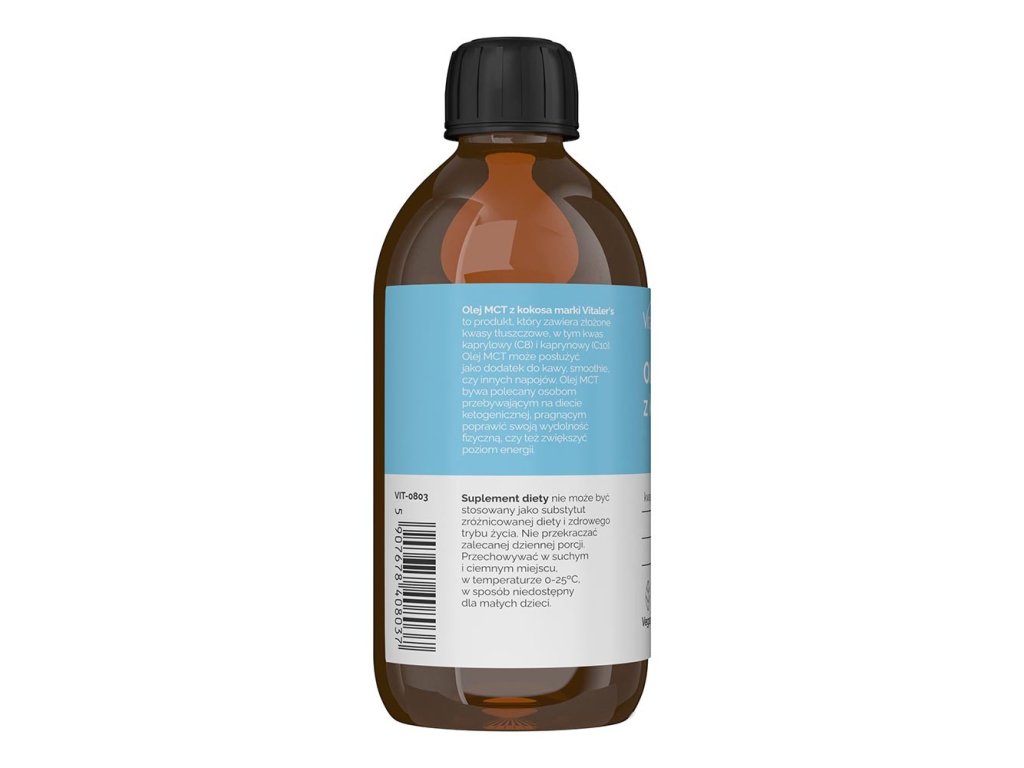 Vitaler's MCT olej je vysoce kvalitní tekutý rostlinný olej, který je bohatým zdrojem MCT mastných kyselin (triglyceridů se středně dlouhým řetězcem). Obsahuje směs C8 (kyselina kaprylová) a C10 (kyselina kaprinová), díky čemuž poskytuje rychlý a stabilní zdroj energie. MCT olej se velmi snadno vstřebává, tráví a metabolizuje, a proto je oblíbený při sportu, nízkosacharidových i ketogenních dietách.