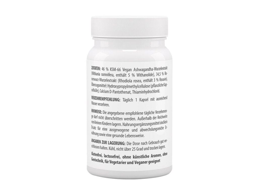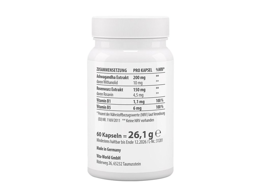 Ašvaganda a růžový kořen jsou v různých kulturách známé pro své adaptogenní schopnosti již po staletí. Ašvaganda, známá také jako indický ženšen, zimní třešeň nebo jedovatý angrešt, je běžná rostlina z čeledi lilkovitých. Hlavní složkou této rostliny je withanolid.Kořen růžovky, latinsky Rhodiola rosea, lze nalézt v Asii a Evropě, stejně jako v Severní Americe. Rostlina vděčí za svůj název růžové vůni, která se uvolní při rozkrojení kořene. Důležitou složkou je rosavin. Náš komplex dále obsahuje vitamín B1 a vitamín B5, které přispívají k normální činnosti nervové soustavy a psychiky.